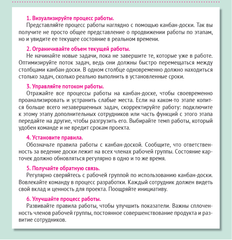 У каждого сотрудника в работе может быть ограниченное количество карточек. Это условие позволит избежать перегруженности и зависания в работе над задачей. Кроме того, ответственность за ведение доски лежит на всех членах рабочей группы. Состояние карточек должно обновляться регулярно в одно и то же время. Канбан-доска будет четко отражать задачи, над которыми работает каждый участник команды, и их состояние, а вы сможете вовремя принимать управленческие решения.
