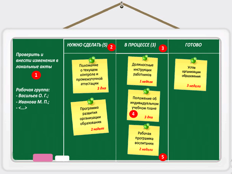 Одна из приоритетных задач школы в этом году – подготовить документы к переходу на новый ВШК. Этот процесс можно разбить на отдельные шаги или мероприятия, т. е. проекты, над которыми будут работать члены одной рабочей группы. Например, проверка локальных актов, оценка ресурсов школы, подготовка к окончанию третьей четверти и т. д. Каждое из таких мероприятий и может стать общим делом или проектом, для которого удобно применить канбан-метод. Так вы сможете вовремя получить готовый продукт, т. е. подготовить все необходимые документы для перехода школы на обновленные стандарты. Посмотрите образец канбан-доски при работе над таким проектом.